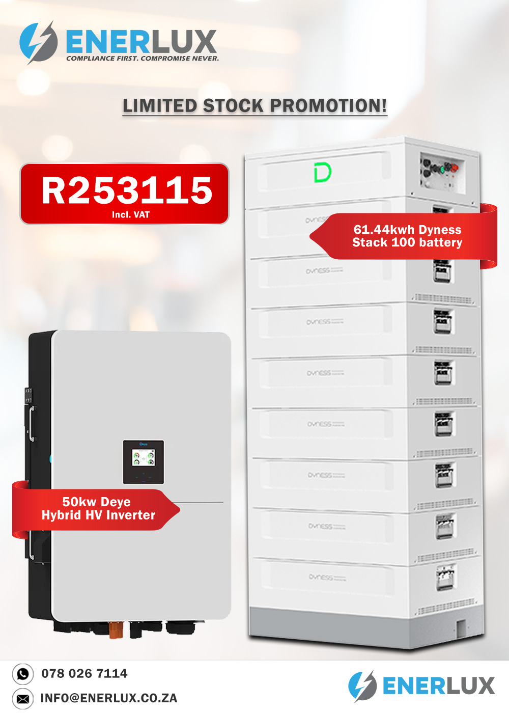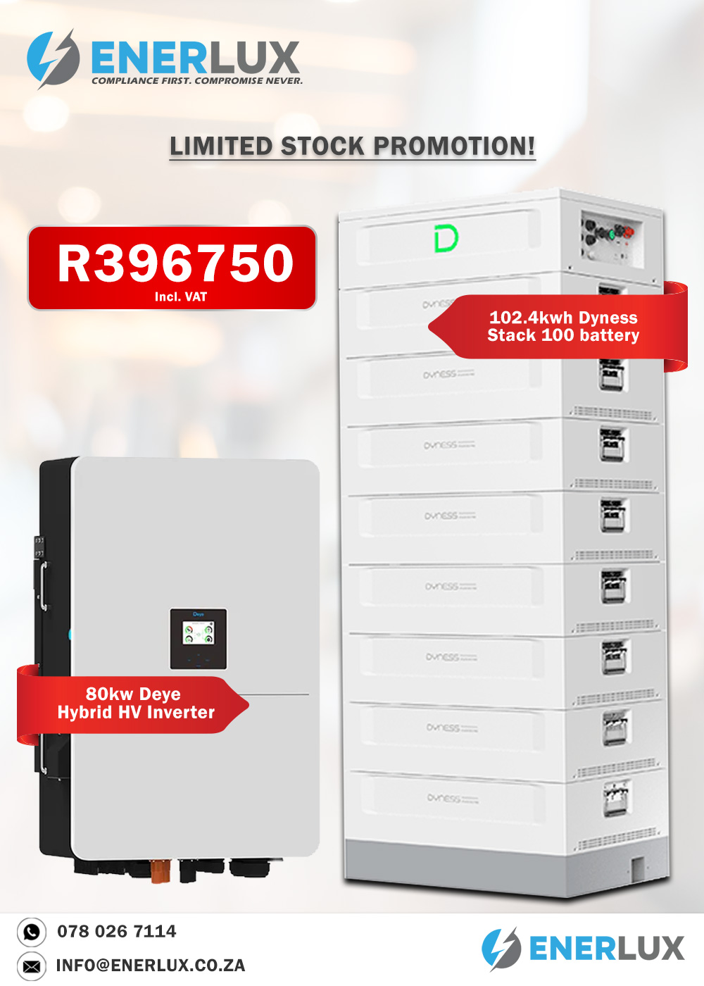 Enerlux promotions provide homeowners and businesses with exclusive savings on solar power systems, inverters, lithium batteries, generators, and professional electrical services. Each promotion is carefully selected to deliver real value through reliable products, expert installation, and compliant electrical work. Whether you are planning to install a solar power system, upgrade your backup power solution, or improve your electrical infrastructure, Enerlux promotions make it easier to invest in dependable energy solutions at competitive prices. Our goal is to help you reduce long-term energy costs while maintaining the highest standards of quality, safety, and performance.