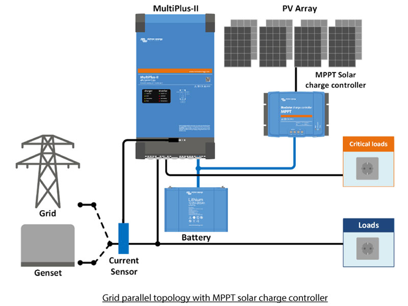 The MultiPlus-II fits seamlessly into all common energy storage topologies